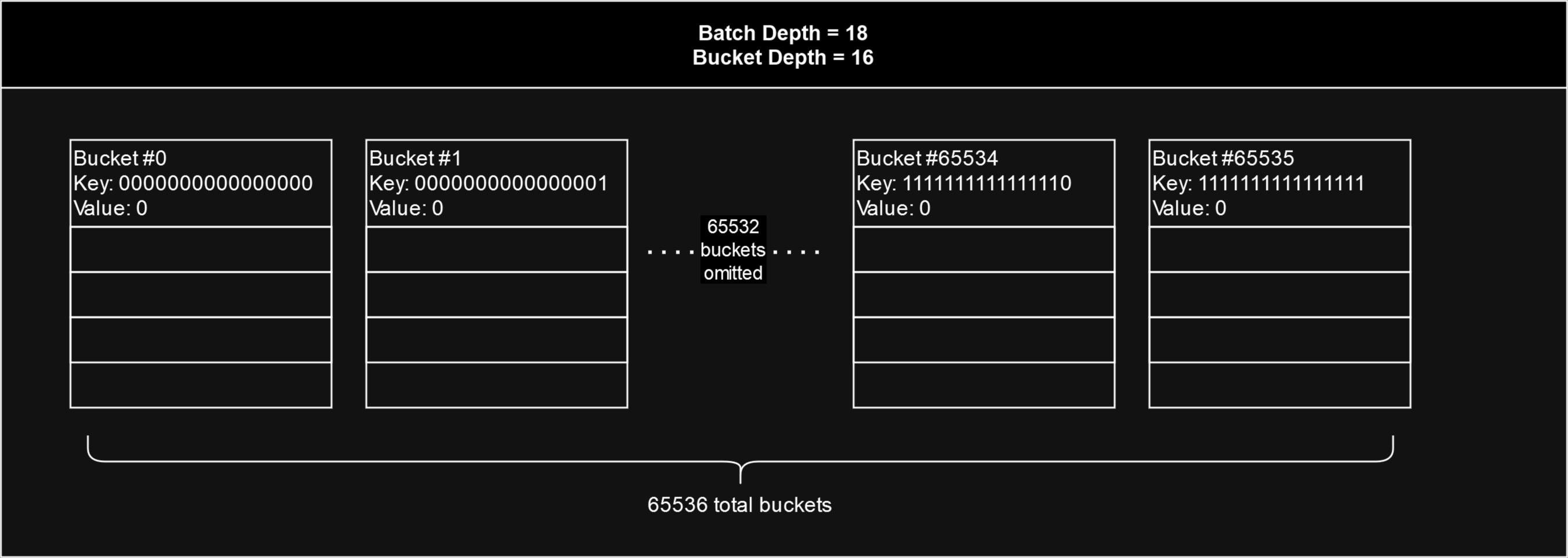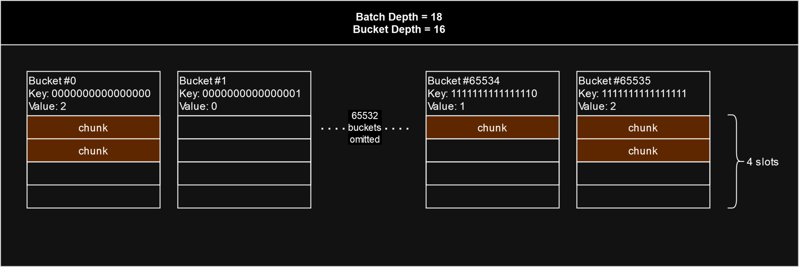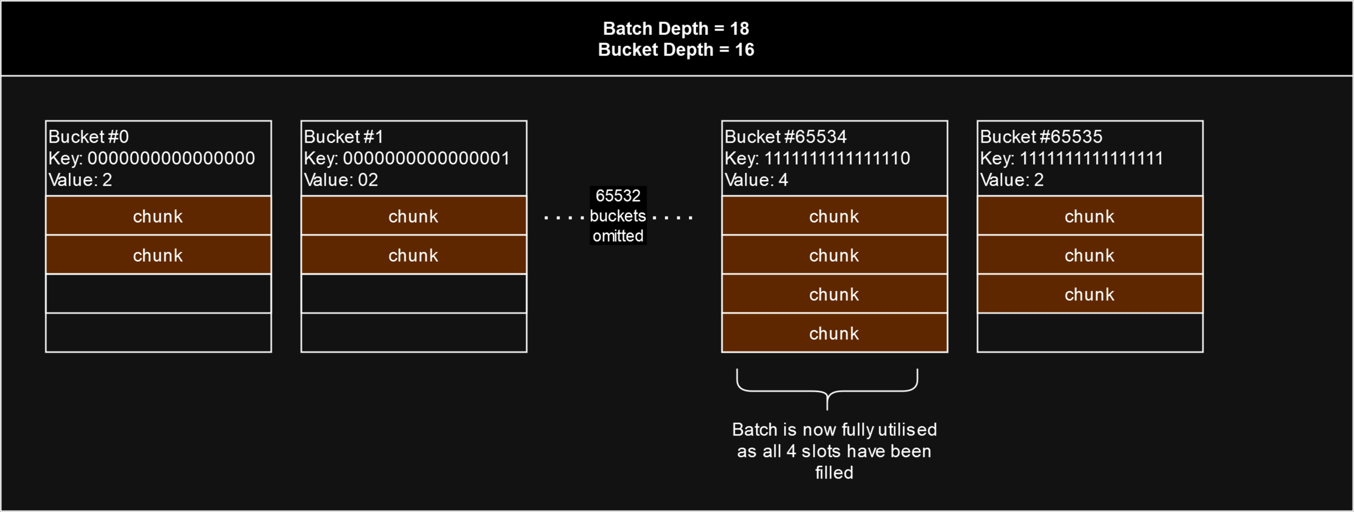 In the diagram below, the batch depth is 18, so there are 2(1816)2^{(18-16)} or 4 slots for each bucket. The utilisation of a batch is simply the highest number of filled slots out of all 65536 entries or "buckets". In this batch, none of the slots in any of the buckets have yet been filled with 4 chunks, so the batch is not yet fully utilised. The most filled slots out of all buckets is 2, so the stamp batch's utilisation is 2 out of 4.